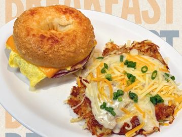 Cheesy bagel with black forest ham, scrambled egg and cheddar cheese with our Loaded Hashbrowns! Back for a limited time only!